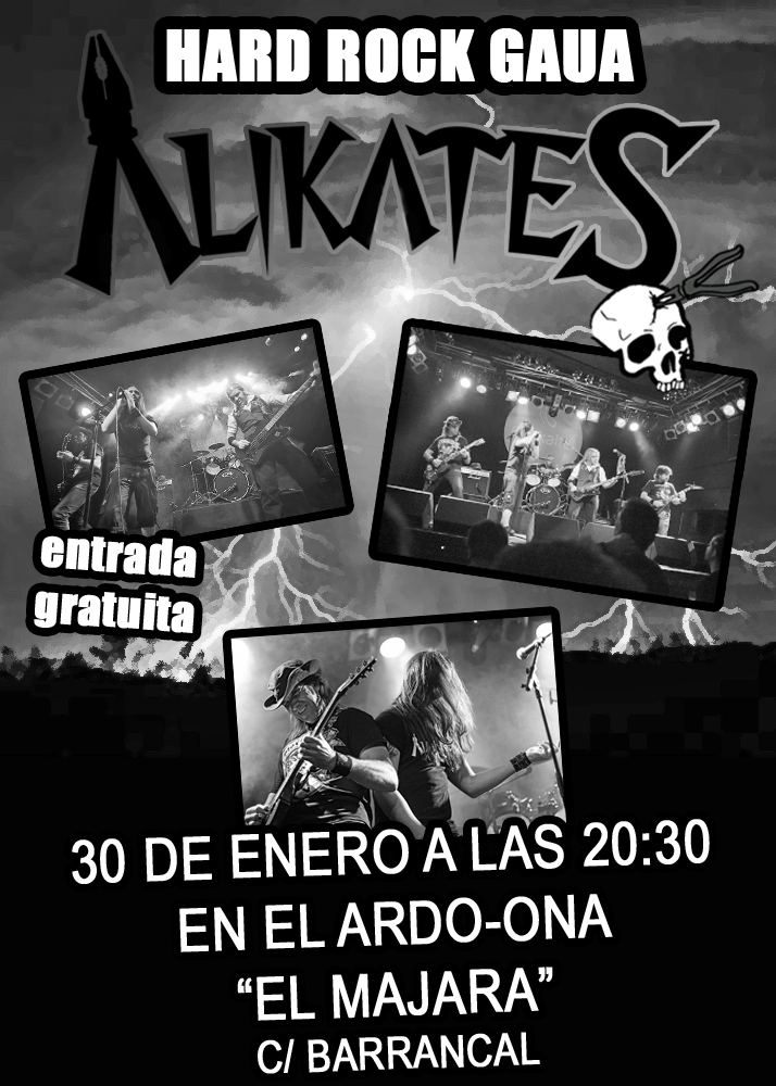 Después de casi un año de ausencia de los escenarios gasteiztarras, ALIKATES, vuelve con unas ganas del copón de descargar el próximo 30 de Enero sábado, el el marco incomparable del Ardo Ona (MAJARA).